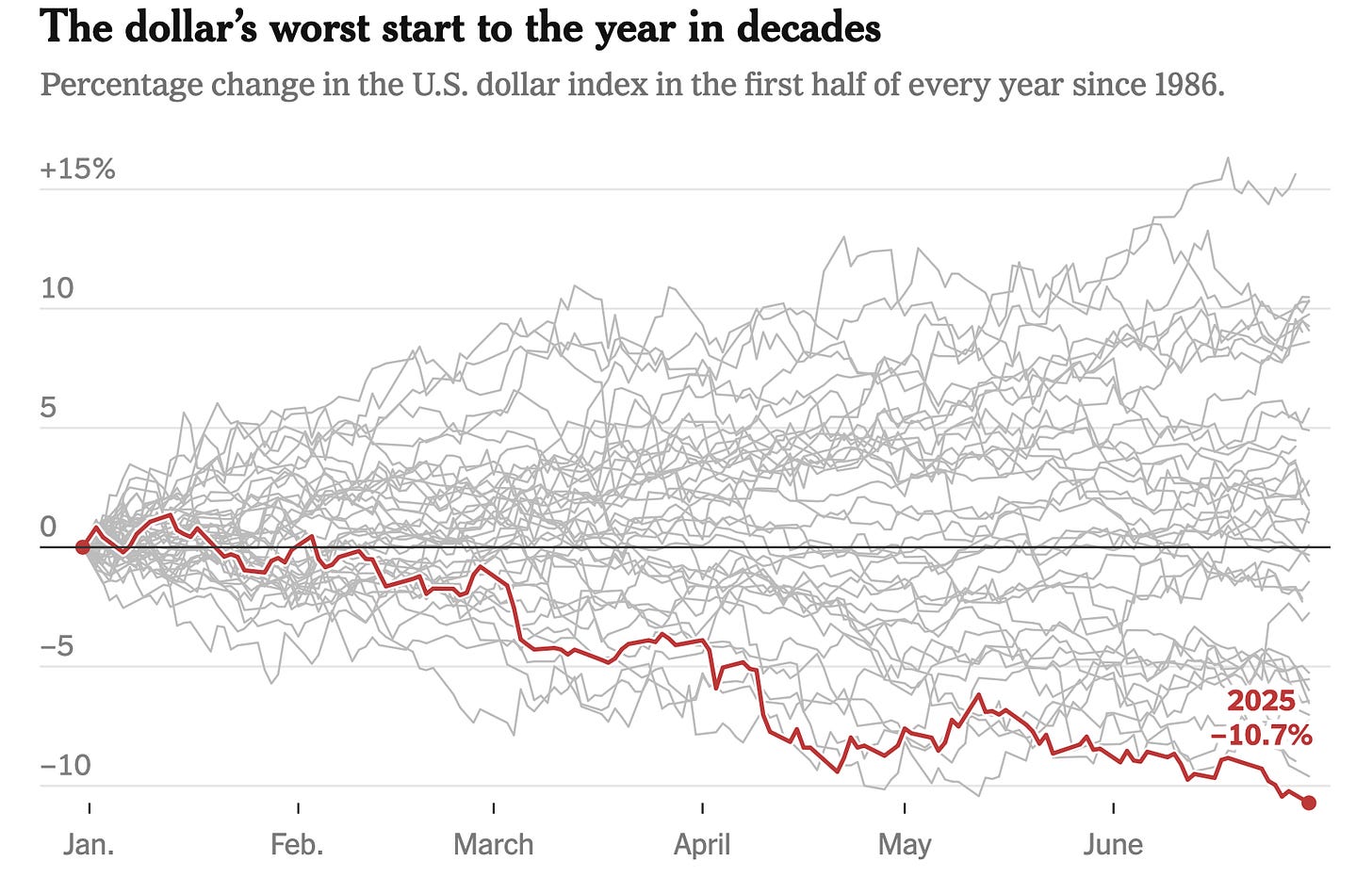 Every move BRICS makes is a direct challenge to the legacy structures that have defined the global order for decades, and none of these shifts are as rapid and as devastating as the decline of the U.S. dollar. 2025 has already become a historic year for the dollar’s downfall where the greenback has seen the worst decline since the United States abandoned the gold standard in 1973. Over just the past six months, the dollar has plummeted by more than 10% in comparison to other major world currencies. This is not just a result of erratic U.S. leadership under Donald Trump, but is also directly tied to BRICS’ de-dollarization strategy. Today, an astonishing 68% of BRICS trade bypasses the U.S. dollar, and nearly 90% of trade between Russia and China alone is done in their own currencies.